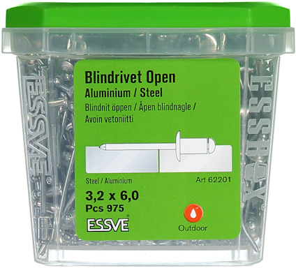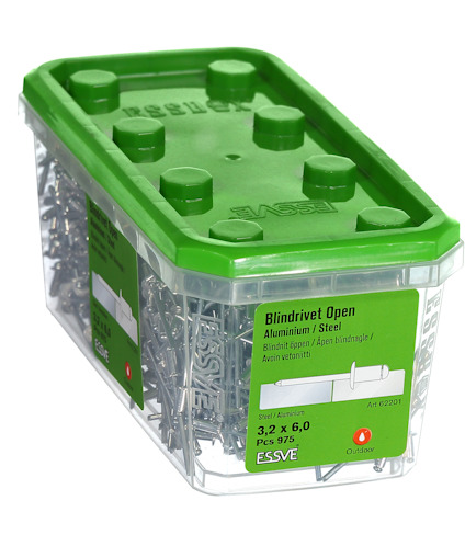 ESSVE Blindnit är lätt att montera med handverktyg eller tryckluftsdrivna verktyg, den ger starka, vibrationssäkra förband med låg-på-platsen-kostnad. ESSVE Blindnit är ett mycket användbart fästelement som ger konstruktörer stora variationsmöjligheter i produktutformning och materialval.