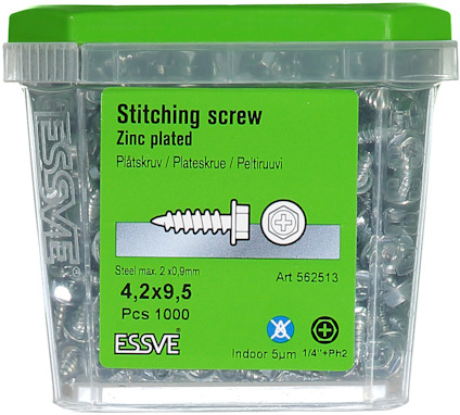 ESSVE Plåtskruv för tunnplåt, FZB med utdragen spets är avsedd för montering/sammanfogning av tunnplåt inomhus. Skruven är tillverkad av härdat stål med blankförzinkad ytbehandling. Den är försedd med sexkantshuvud med krysspår. Rekommenderat varvtal vid montering 1800-2500/min.