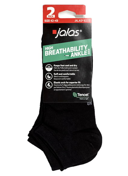 JALAS 8215, Tunn, sval och låg ankelstrumpa stickad i Tencel™ Modal-mesh för bättre ventilation. Håller fötterna svala och torra. Elastiskt fotvalv för överlägsen passform. Tvättbar i 40° C. För vit version välj 8216.