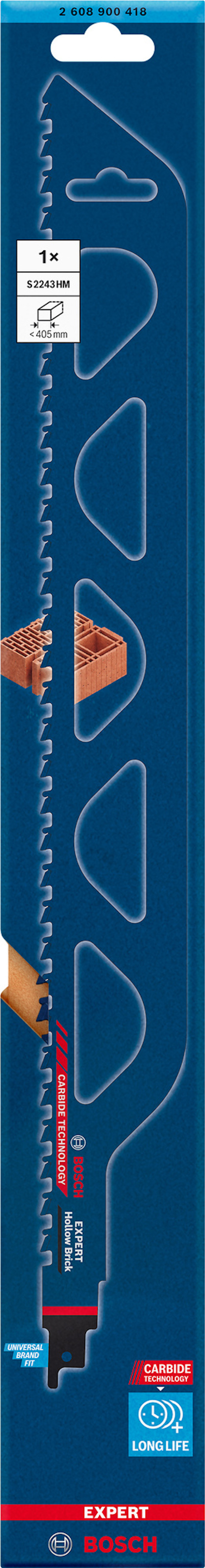 Carbide Technology för lång livslängd för sågning av ihåliga tegelstenar och lättklinkerblock - För byggarbetare och murare är möjligheten att såga ihåliga tegelstenar som Poroton samt lättklinkerblock på plats ett sätt att arbeta snabbt och effektivt. De flesta tigersågblad håller dock inte särskilt länge när de används på så slipande mineralmaterial. Med ett specialiserat hårdmetallblad som EXPERT 'Hollow Brick' kan murare smidigt såga till ihåliga tegelstenar i rätt storlek, och utan att förstöra sina blad. För att klara av arbetsuppgifter som vanliga tigersågblad i bimetall inte kan hantera, använder Bosch EXPERT 'Hollow Brick' tigersågblad Bosch Carbide Technology och är specialutformat för skärning av ihåliga tegelstenar. Skivans breda kropp och extra tjocka material säkerställer stabilitet för hantverkare som behöver göra exakta snitt, medan de lödda hårdmetalltänderna är tillräckligt robusta för att skära tegelstenar från morgon till kväll. Tack vare Bosch EXPERT 'Hollow Brick' tigersågblad blir tigersågen snabbt ett favoritverktyg bland murare. Skär till tegelstenar i rätt storlek med Bosch Carbide Technology. Passar alla tigersågar med S-skaft.
