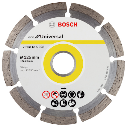 För allmänna byggnadsmaterial - Eco for Universal segmenterade diamantkapskivor är det bästa valet för tillförlitliga snitt i allmänna byggnadsmaterial. De sintrade skärsegmenten ger utmärkta resultat i en mängd olika material inklusive betong, tegel, kalksten och taktegel. Diamantskivan kan användas med handhållna vinkelslipar. Med 22,23 mm hål för standardvinkelslipar med låsmutter.