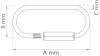Snabblänk av stål respektive syrafast rostfritt 316-stål med gänga. Angivna värden för rekommenderad maxvikt är beräknade och garanteras ej. A=längd, B=bredd, C=tjocklek.