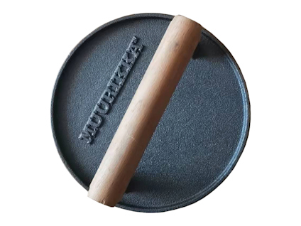 Rund grillpress av gjutjärn. Med handtag av trä. Håller maten på plats och förkortar grilltiden. Perfekt för exempelvis hamburgare. Vikt 1 kg. Diameter 18 cm.